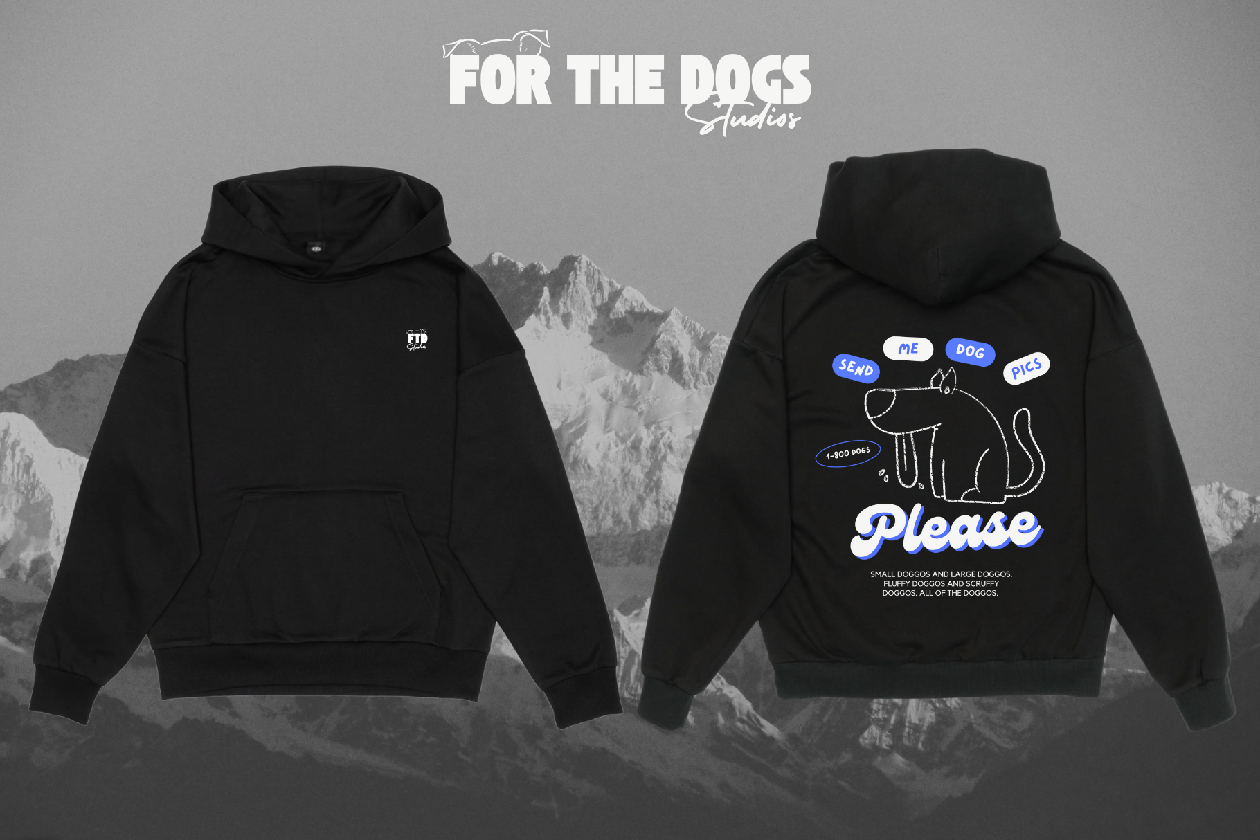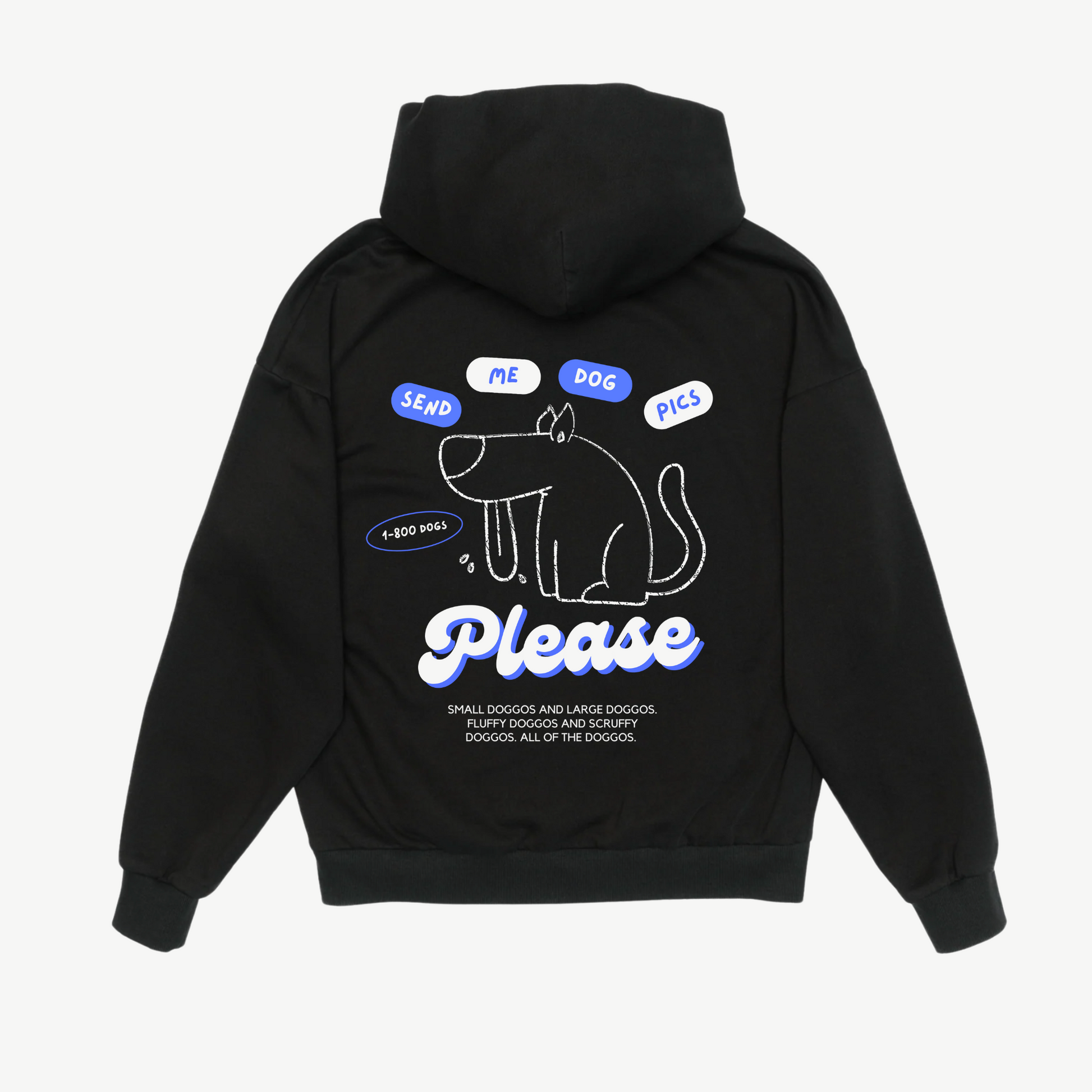 Our "Dog Pics" hoodie features a large graphic printed on the back.