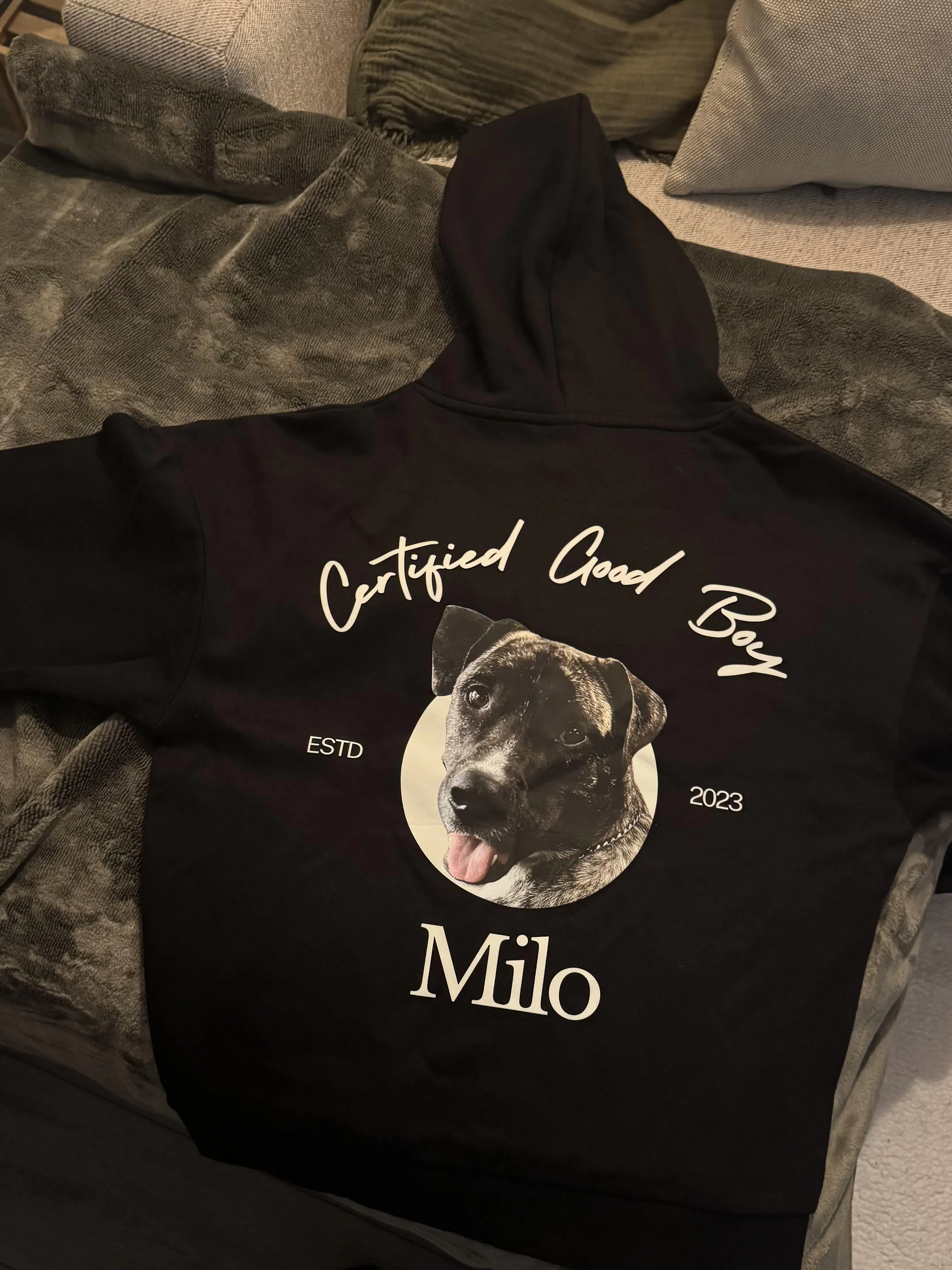 This hoodie features a cartoon pic of your pup with our signature "Certified Good Boy/Girl" design. The graphic is printed on the back of the hoodie and will also include your pet's name and birth year.