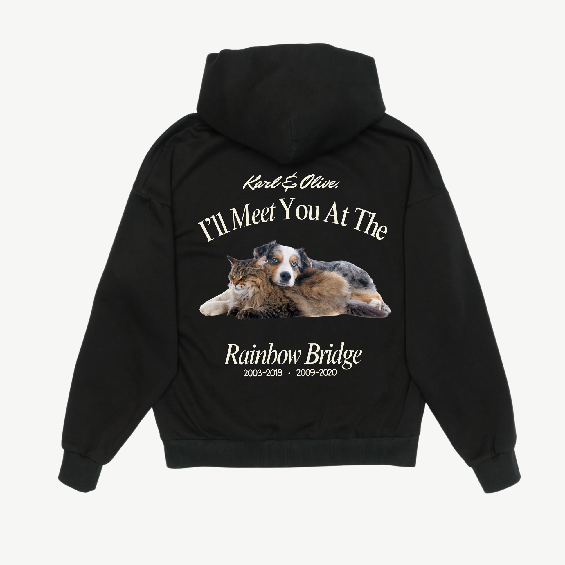 Our Rainbow Bridge Hoodie features a small chest logo saying "Always & Forever" and a customized large graphic of your pup on the back featuring their name, photo, year they were born and the year they crossed the rainbow bridge <3